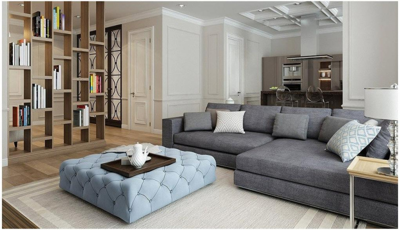 Один из самых распространённых приёмов. Ковер помогает выделить функциональные зоны в комнате без перегородок и массивной мебели. Например, в гостиной достаточно постелить ковер под диванную группу, чтобы отделить её от обеденной или рабочей зоны. Ковёр в спальне у кровати делает пространство более приватным и уютным, а в детской помогает визуально выделить игровую территорию. Такой способ особенно актуален для квартир-студий и помещений с открытой планировкой.